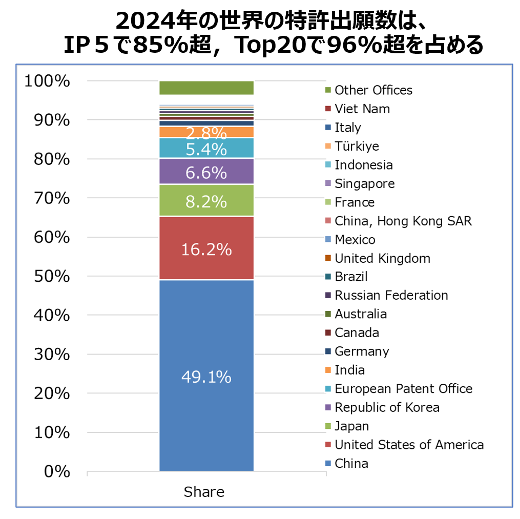 下図に示すように、世界の特許出願の合計を100%とし、特許庁別に多い順から合計していくと、実にTop20の合計は96%を超えます。