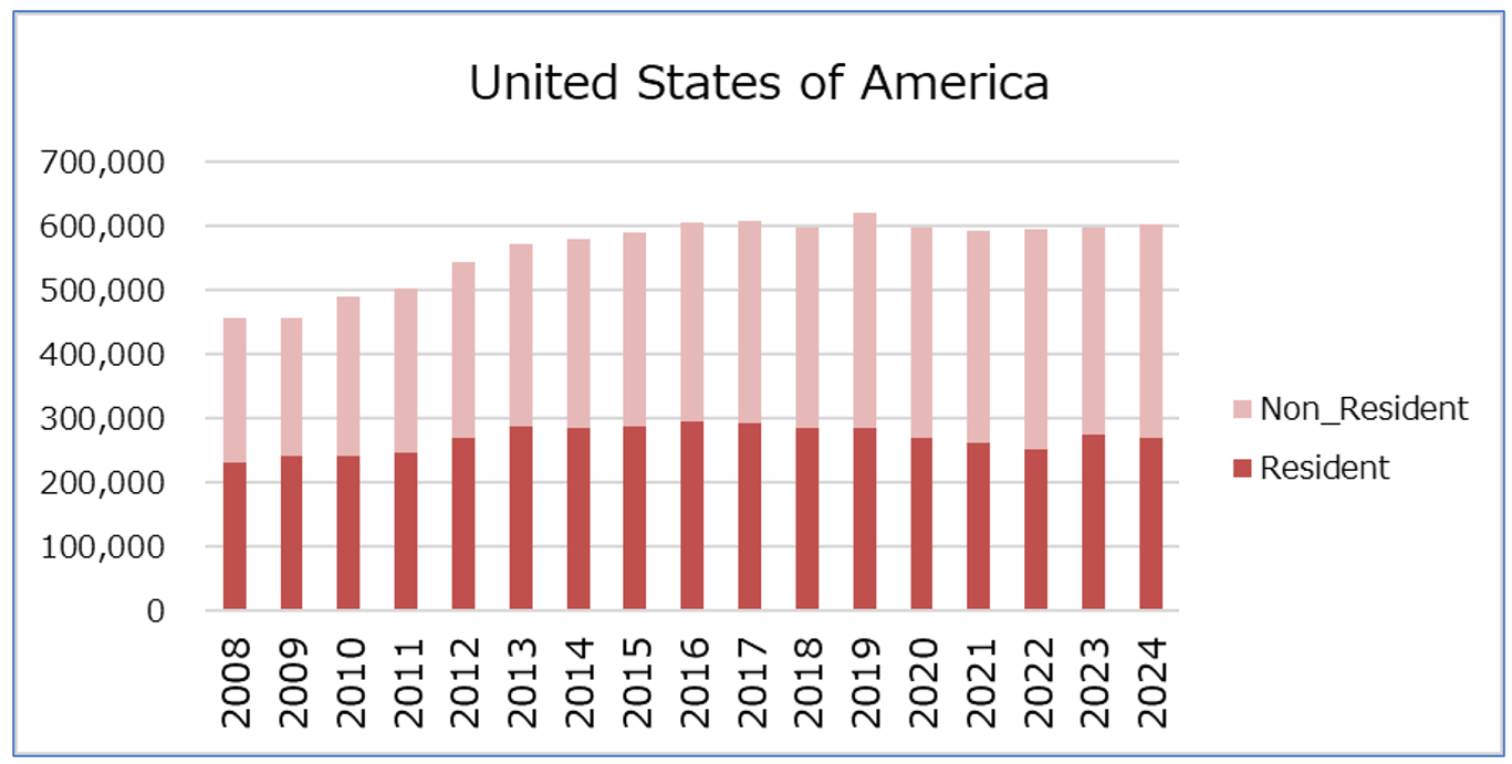 米国は、半分以上が非居住者による出願、つまり米国外からの出願になります。