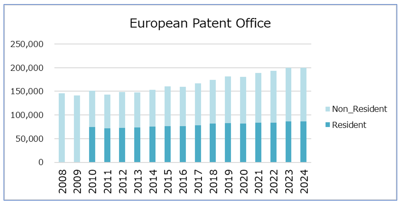 欧州特許制度は、欧州特許庁に出願することで、複数の欧州諸国における特許権を一括して取得できる制度です。欧州の特徴は、米国と同様、非居住者からの出願の割合が高いことです。