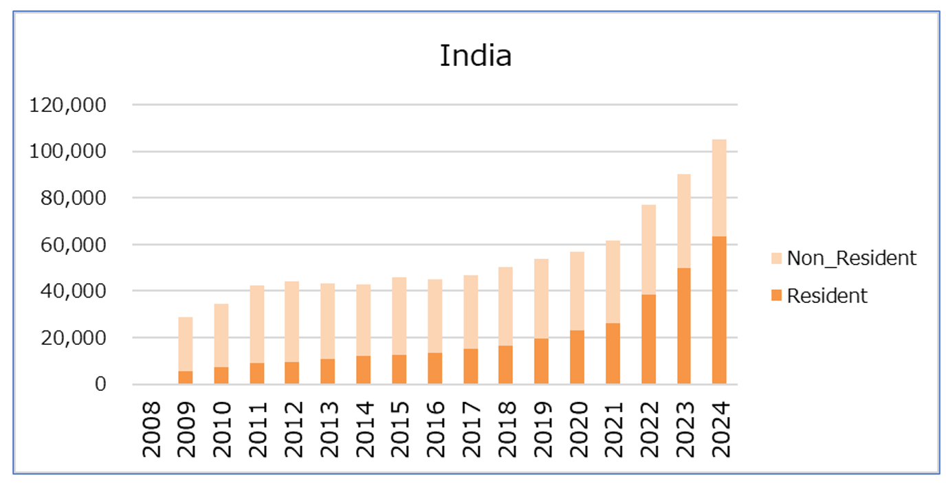 2008年からの各年についての出願数を居住者と非居住者で区分けしてグラフ化すると、中国は9割以上が居住者、つまり国内出願であることが分かります。