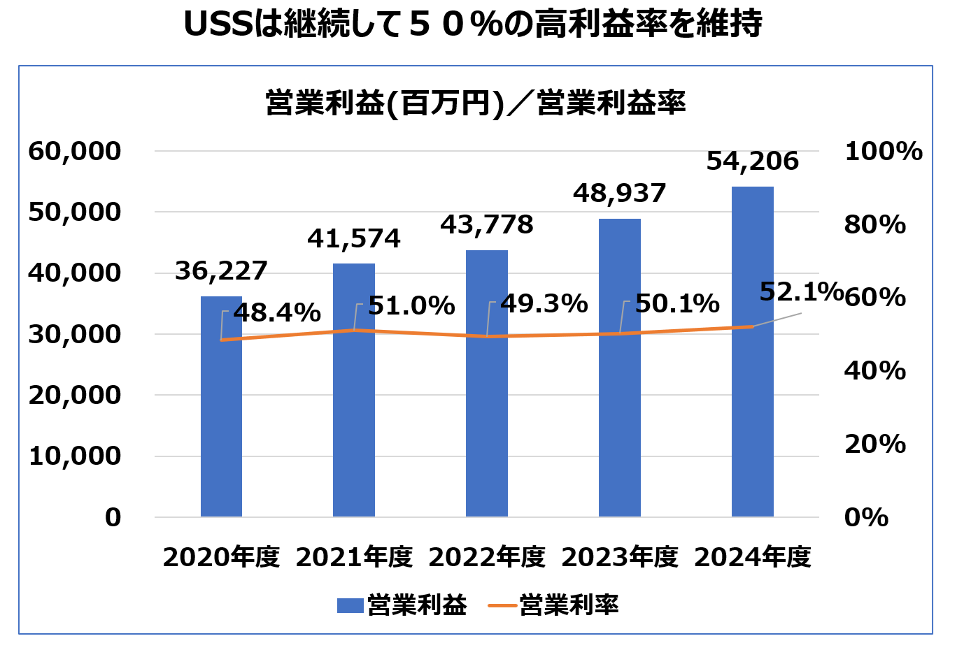 下記に示すように、同社は複数年にわたり営業利益率50%前後を維持しています。